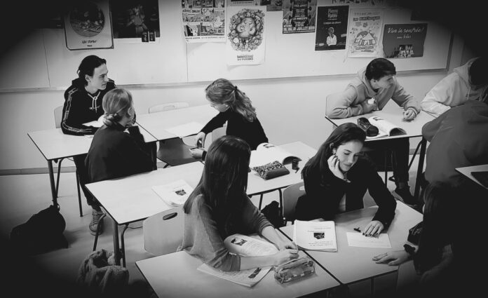Met 30 man in een klaslokaal,